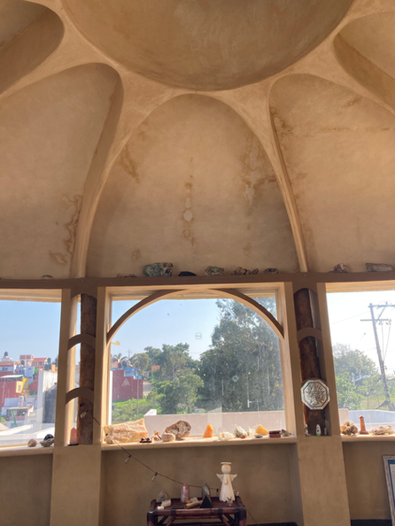 La arquitectura oval de este salón, resguardado por piedras y cristales de diversas formas y tamaños, genera un espacio armonioso, perfecto para sesiones de meditación, círculos de canto, conciertos íntimos, terapias sonoras y ceremonias de todo tipo.